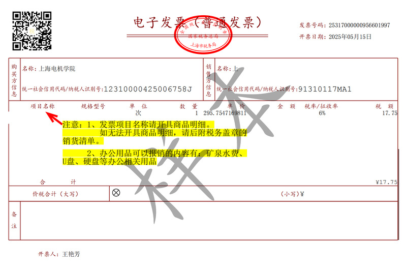 发票项目名称应开具商品明细。如为电子发票,需查验后加附“发票查验单”