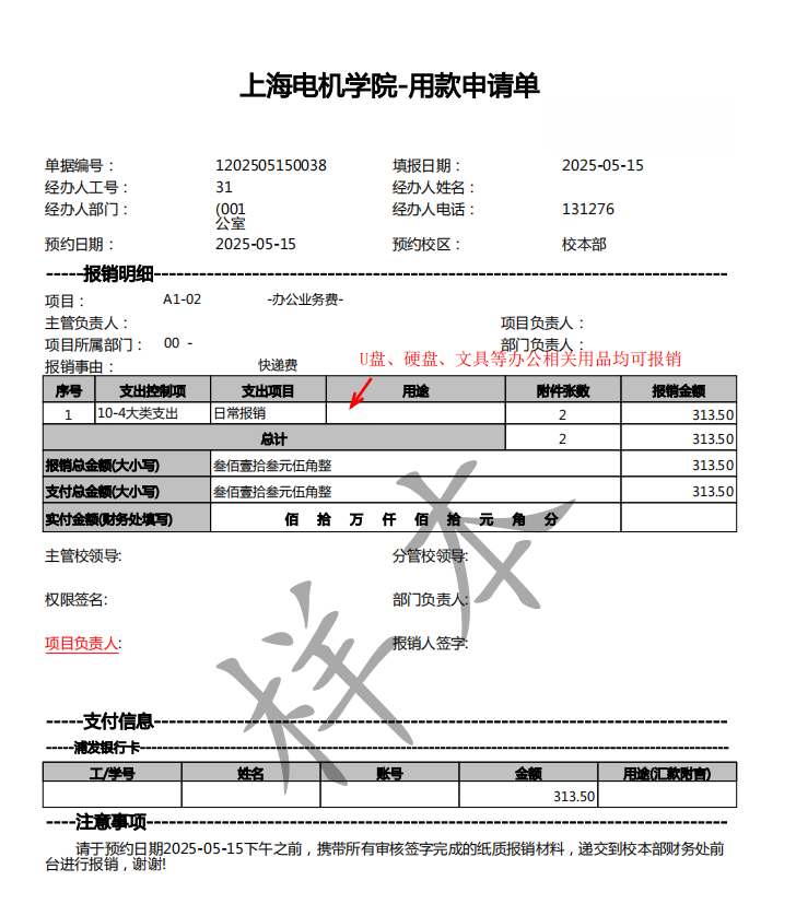 智慧校园融合门户→应用中心→财务系统→网上报销→用款申请单→填写打印纸质件→附发票等材料→签字→投递至临港校区行政楼财务大厅/闵行校区办公楼财务处