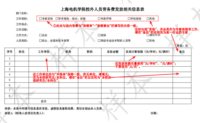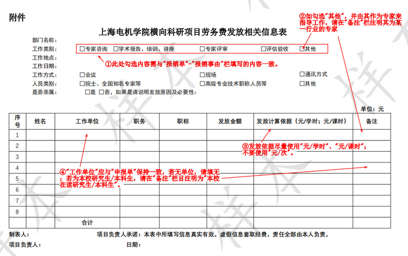 3、信息表发放计算依据需要填写发放金额的计算过程,例如:800元/天*3天=2400元 或300元/学时*3学时=900元。文件上发放标准为**元/学时的请尽量按学时数填写,不要按天/次填写。