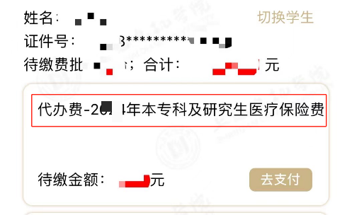 第3步:选择“代办费-2026年本专科及研究生医疗保险费”收费批次,确认收费内容后,完成缴费。